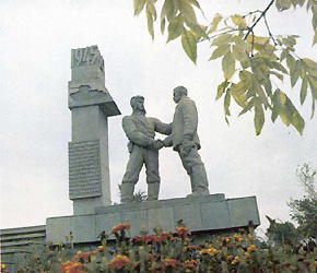 монумент "Танкист и колхозник", символизирующий единство фронта и тыла, а у