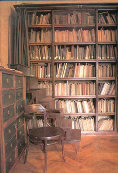 тахта, стол-бюро, картотечные шкафы, два стеллажа и книжный шкаф с